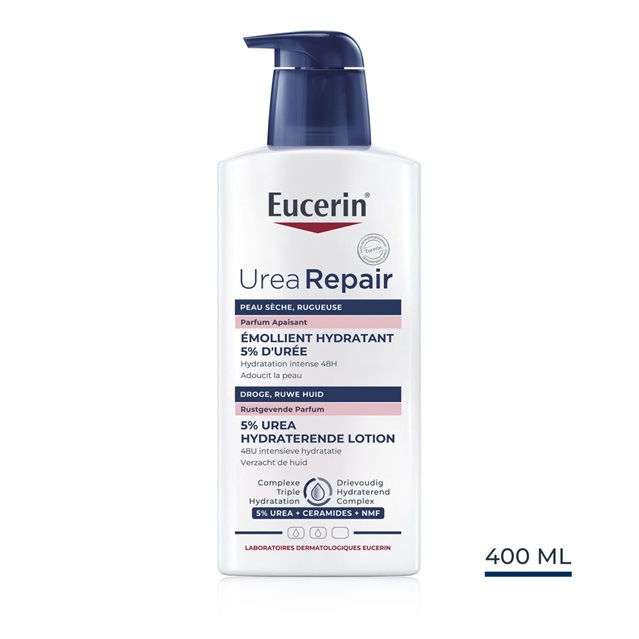 L'Emollient 5% d'Urée Parfumé UreaRepair d'EUCERIN apaisent immédiatement les signes de sècheresse cutanée et retardent leur réapparition. La peau est souple et douce au toucher. La peau est plus résistante et la réapparition des signes de la peau sèche est retardée. La formule contenant des lipides, comme les Céramides, renforce le pouvoir protecteur de la barrière hydrolipidique et limite la perte insensible en eau. La formule contenant de l'Urée et des NMF (Facteurs Naturels d'Hydratation) améliore les capacités de fixation de l'eau dans l'épiderme et donc le niveau d'hydratation cutanée. L'émulsion huile-dans-eau est rapidement absorbée et est non collante.